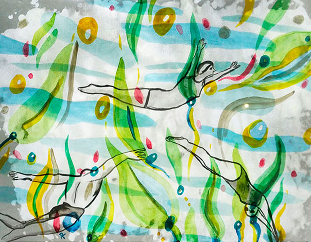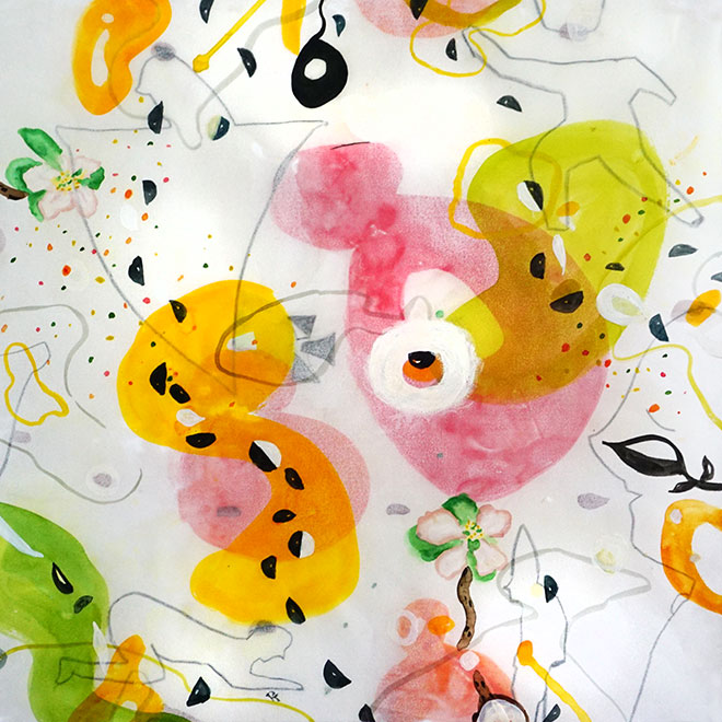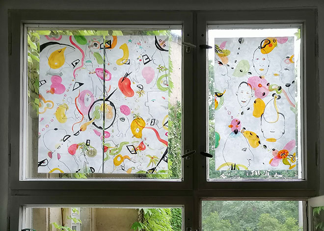 Hier wird es floraler. Die Bilder sind von 2 Seiten gemalt, gewachst und dadurch transparent geworden.
